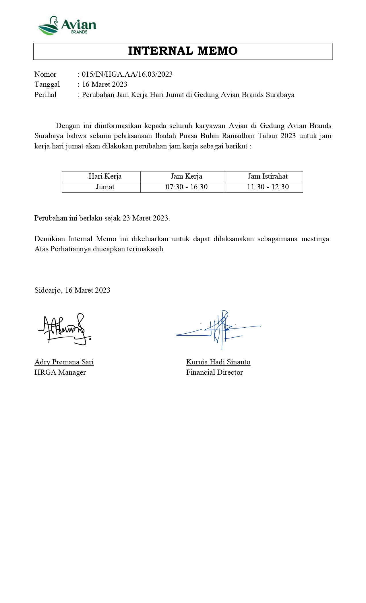 Dengan ini kami informasikan kepada seluruh karyawan PT Avia Avian Tbk Gedung Avian Brands Surabaya terkait Perubahan Jam Kerja hari Jumat yang berlaku mulai tanggal 23 Maret 2023. Terlampir Internal Memo yang telah ditandatangani Management.